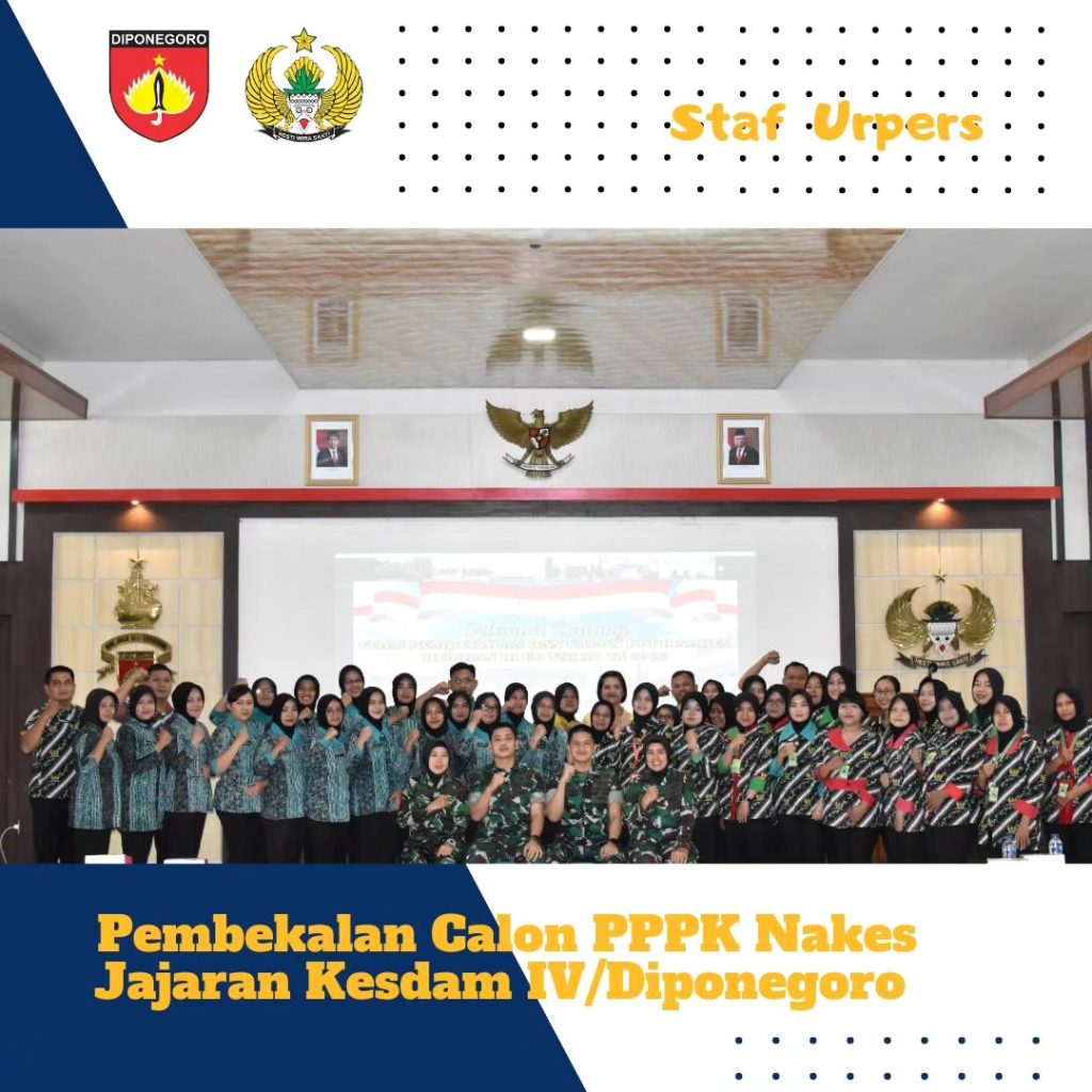 Calon PPPK Nakes Jajaran Kesdam IV/Diponegoro menerima Pembekalan dari Tim Spersad dalam hal ini Spaban VI/Bin PNS Spersad. Kegiatan dilaksanakan di Aula Kesdam IV/Diponegoro baik secara luring maupun daring. Sebanyak 160 personel Calon PPPK Nakes jajaran Kesdam IV/Diponegoro mengikuti Pembekalan tersebut.Wakakesdam IV/Diponegoro Letkol Ckm dr.Virni Sagita Ismayawati,M.A.R.S., beserta Kasituud Kesdam IV/Diponegoro Myr Ckm Suparman,S.Kep turut hadir pada acara Pembekalan Calon PPPK Nakes Kemhan RI UO TNI AD TA.2023.
