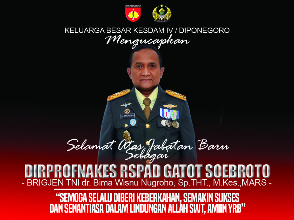 Keluarga besar Kesdam IV/Dip mengucapkan Selamat Atas Jabatan baru sebagai “DIRPROFNAKES RSPAD GATOT SOEBROTO” Brigjen TNI dr Bima Wisnu N, Sp.THT.,M.Kes., MARS
